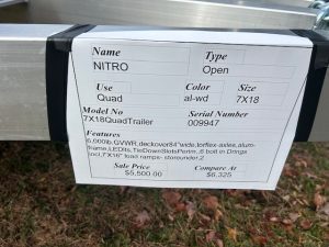 NITRO Brand, 4 place Quad Trailer, 7’wide by 16 ft. long , 6,000 lb. GVWR, Aluminum Frame 1,250 lbs. empty weight, ID# 009947