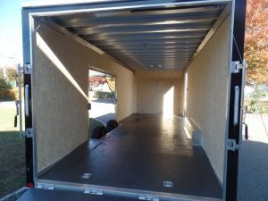 - Interior: Typically has 3/8″ engineered walls, open stud ceiling with mill finish cove trim, and a dome light with a wall switch. Options include aluminum walls and ceiling finishes.